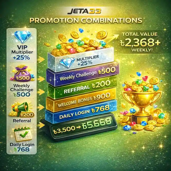Jeta33 offers 8 major promotions, and daily login rewards stack beautifully with 6 of them. Here’s your complete compatibility guide: